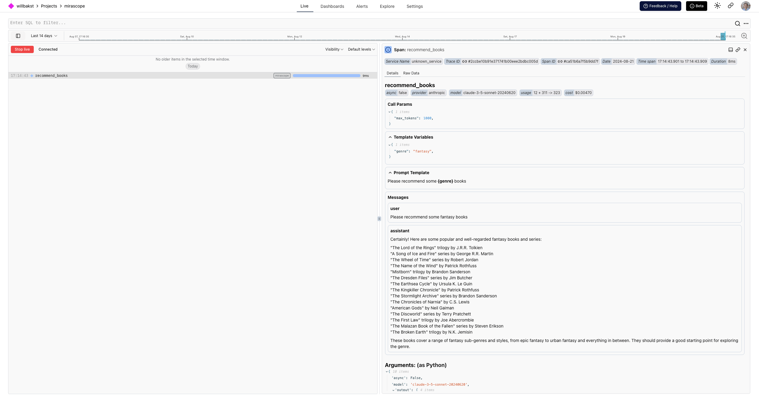 • A span around the recommend_books that captures items like the prompt template, templating properties and fields, and input/output attributes